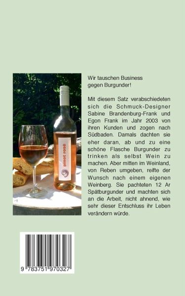 Wir tauschen Business gegen Burgunder - mit diesem Satz verabschiedeten sich die Goldschmiede und Schmuckdesigner Egon Frank und Sabine Brandenburg-Frank im Jahr 2003 von ihren Kunden, verkauften ihre Schmuck-Manufaktur und zogen nach Südbaden ins Markgräflerland. Damals dachten sie eher daran, ab und zu eine schöne Flasche Burgunder zu trinken, als selbst Wein zu machen. Aber mitten im Weinland, von Reben umgeben, reifte der Wunsch nach einem eigenen Weinberg. Sie pachteten 12 Ar Spätburgunder-Reben und machten sich an die Arbeit, nicht ahnend, wie grundlegend dieser Entschluss ihr Leben verändern würde. Das Hobby wurde zum zweiten Beruf, die beiden besuchten die Abendschule, machten eine Ausbildung zum Winzer und legten die Gesellenprüfung ab. Auch der Schmuck lässt sie nicht los. Aus ihrer Geschichte und ihren beiden Professionen entstand ein Konzept, das Leben und Arbeit verbindet.