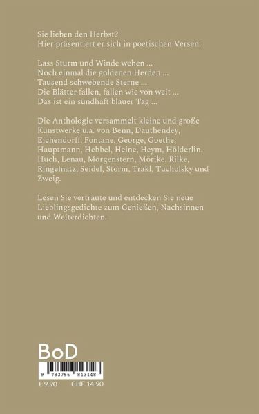 Sie lieben den Herbst?Hier präsentiert er sich in poetischen Versen:Lass Sturm und Winde wehen ...Noch einmal die goldenen Herden ...Tausend schwebende Sterne ...Die Blätter fallen, fallen wie von weit ...Das ist ein sündhaft blauer Tag ...Die Anthologie versammelt kleine und große Kunstwerke u.a. von Benn, Dauthendey, Eichendorff, Fontane, George, Goethe, Hauptmann, Hebbel, Heine, Heym, Hölderlin, Huch, Lenau, Morgenstern, Mörike, Rilke, Ringelnatz, Seidel, Storm, Trakl, Tucholsky und Zweig.Lesen Sie vertraute und entdecken Sie neue Lieblingsgedichte zum Genießen, Nachsinnen und Weiterdichten.