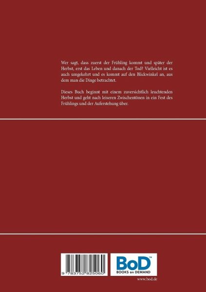 Wer sagt, dass zuerst der Frühling kommt und später der Herbst, erst das Leben und danach der Tod? Vielleicht ist es auch umgekehrt und es kommt auf den Blickwinkel an, aus dem man die Dinge betrachtet.Dieses Buch beginnt mit einem zuversichtlich leuchtenden Herbst und geht nach leiseren Zwischentönen in ein Fest des Frühlings und der Auferstehung über.
