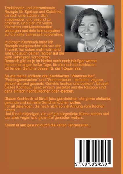 Traditionelle und internationale Rezepte für Speisen und Getränke, die dich unterstützen, dich ausgewogen und gesund zu ernähren, und dich mit vielen Vitaminen und Mineralstoffen versorgen und die dein Immunsystem auf die kalte Jahreszeit vorbereiten.In diesem Kochbuch habe ich Rezepte ausgesucht, die von der Thermik her schon mehr wärmend sind und auch deinen Körper auf die kalte Jahreszeit vorbereiten.Dennoch gibt es ja im Herbst auch noch häufiger warme, manchmal sogar heiße Tage, für die noch die leichteren, kühlenden Gerichte besser für den Körper sind.So, wie meine anderen drei Kochbücher "Winterzauber", "Frühlingserwachen" und "Sommertraum - Einfache, vegane, glutenfreie und gesunde Gerichte kochen und backen", ist auch dieses Kochbuch ganz einfach gestaltet und die Rezepte sind ganz einfach nachzukochen oder -backen.Dieses Kochbuch ist für all jene geschrieben, die gerne einfache, gesunde und schnelle Gerichte kochen wollen.Für all diejenigen, die noch nicht so viel Ahnung vom Kochen haben. Und für all diejenigen, die auf gut bürgerliche Küche stehen und das alles vegan und glutenfrei genießen wollen.Komm fit und gesund durch die kalten Jahreszeiten.