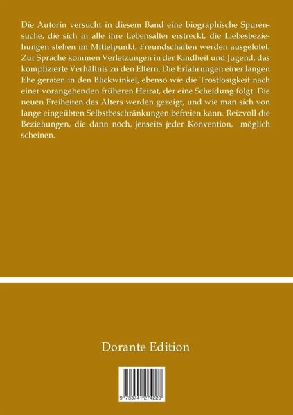 Die Autorin versucht in diesem Band eine biographische Spurensuche, die sich in alle ihre Lebensalter erstreckt, die Liebesbeziehungen stehen im Mittelpunkt, Freundschaften werden ausgelotet. Zur Sprache kommen Verletzungen in der Kindheit und Jugend, das komplizierte Verhältnis zu den Eltern. Die Erfahrungen einer langen Ehe geraten in den Blickwinkel, ebenso wie die Trostlosigkeit nach einer vorangehenden früheren Heirat, der eine Scheidung folgt. Die neuen Freiheiten des Alters werden gezeigt, und wie man sich von lange eingeübten Selbstbeschränkungen befreien kann. Reizvoll die Beziehungen, die dann noch, jenseits jeder Konvention, möglich scheinen.