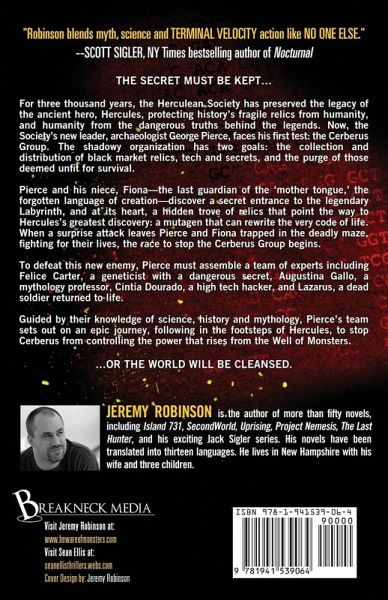 THE SECRET MUST BE KEPT... For three thousand years, the Herculean Society has preserved the legacy of the ancient hero, Hercules, protecting history's fragile relics from humanity, and humanity from the dangerous truths behind the legends. Now, the Society's new leader, archaeologist George Pierce, faces his first test: the Cerberus Group. The shadowy organization has two goals: the collection and distribution of black market relics, tech and secrets, and the purge of those deemed unfit for survival. Pierce and his niece, Fiona-the last guardian of the 'mother tongue,' the forgotten language of creation-discover a secret entrance to the legendary Labyrinth, and at its heart, a hidden trove of relics that point the way to Hercules's greatest discovery: a mutagen that can rewrite the very code of life. When a surprise attack leaves Pierce and Fiona trapped in the deadly maze, fighting for their lives, the race to stop the Cerberus Group begins. To defeat this new enemy, Pierce must assemble a team of experts including Felice Carter, a geneticist with a dangerous secret, Augustina Gallo, a mythology professor, Cintia Dourado, a high tech hacker, and Lazarus, a dead soldier returned to life. Guided by their knowledge of science, history and mythology, Pierce's team sets out on an epic journey, following in the footsteps of Hercules, to stop Cerberus from controlling the power that rises from the Well of Monsters. ...OR THE WORLD WILL BE CLEANSED. Jeremy Robinson and Sean Ellis, the international bestselling team behind the Jack Sigler thrillers, including Savage and Cannibal, return with a new series that rewrites the way we see history. Rivaling the best of Matthew Reilly and James Rollins, Herculean combines a blistering pace with fringe science and myths reborn.