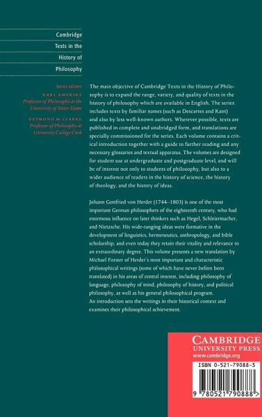 Johann Gottfried von Herder (1744-1803) is one of the most important German philosophers of the eighteenth century, who had enormous influence on later thinkers such as Hegel, Schleiermacher and Nietzsche. His wide-ranging ideas were formative in the development of linguistics, hermeneutics, anthropology and bible scholarship, and even today they retain their vitality and relevance to an extraordinary degree. This volume presents a new translation of Herder's most important and characteristic philosophical writings (some of which have never before been translated) in his areas of central interest, including philosophy of language, philosophy of mind, philosophy of history and political philosophy, as well as his general philosophical program. An introduction sets the writings in their historical context and examines their philosophical achievement.