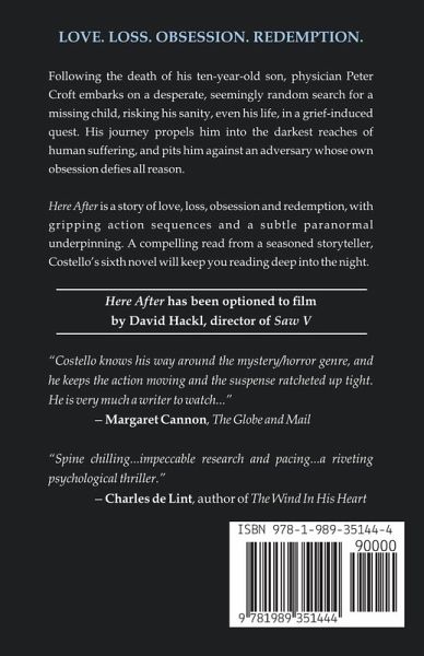 LOVE. LOSS. OBSESSION. REDEMPTION. Following the death of his ten-year-old son, physician Peter Croft embarks on a desperate, seemingly random search for a missing child, risking his sanity, even his life in a grief-induced quest. His journey propels him into the darkest reaches of human suffering, and pits him squarely against an adversary whose own obsession defies all reason. Here After is a story of love, loss, obsession and redemption, with gripping action sequences and a subtle paranormal underpinning. A compelling read from a seasoned storyteller, Costello's sixth novel will keep you reading deep into the night. Here After has been optioned to film by David Hackl, director of Saw V. "An...effective missing-child story with a twist." - Kirkus Reviews (kirkusreviews.com)