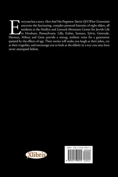 Everyone has a story. Here And Not Forgotten: Stories Of A Wiser Generation uncovers the fascinating, complex personal histories of eight elders from age eighty-three to ninety-five, all residents at the Madlyn and Leonard Abramson Center for Jewish Life in Horsham, Pennsylvania. Lilly, Esther, Samson, Sylvia, Gertrude, Herman, Milt and Gene are distinct individuals. Two are Holocaust survivors but have chosen to overcome their pasts in different ways. Two are passionate musicians but pursued different routes with their talents. One prospers from the accomplishments of her grandchildren and the still-thriving relationship with her 97-year old brother. One uses the stock market to satisfy his zeal for business. One uses painting and drawing to "set himself free". Eight people with over 714 years of experience. Each story has its own colors, textures, and patterns, but together they create a quilted illustration of a generation quieted by the effects of age. Their vivid anecdotes and timeless lessons are surprising yet relatable. You'll learn about their childhoods, the importance of Judaism in their lives, the jobs they held and the challenges they faced. You'll learn about their parents and siblings and children, the way they met their spouses, the way their spouses died. They'll make you laugh at their jokes, cry at their tragedies, and hopefully will encourage you to look at the elderly in a way you never attempted before. Here And Not Forgotten: Stories Of A Wiser Generation brings to life the quote by artist, poet, and writer Kalil Gibran: "Seek ye counsel of the aged, for their eyes have looked on the faces of the years and their ears have hearkened to the voices of Life. Even if their counsel is displeasing to you, pay heed to them."