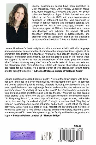 This is a poetic journey of family and landscape and their interconnectedness. The "scent of humanity" weaves its way gently through the pages with an eloquent ease that wraps the reader in a cocoon of comfort. Here at the Crux embraces the intergenerational legacies of an immigrant grandmother's exchange of "hymns for sad ballads". It carries us into the uncertainties of the recent past and present with "choices shrinking every day." A poet's words taste of cinders and rats eat the philosophy book. Here at the Crux is filled with careful observation and a tender regard for our frailties. It's a poetic journey of vivid stories, rich in truth telling and life brought full circle.