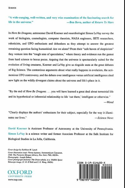The discovery of life on other planets would be perhaps the most momentous revelation in human history, more disorienting and more profound than either the Copernican or Darwinian revolutions, which knocked the earth from the centre of the universe and humankind from its position of lofty self-regard. In Here Be Dragons, astronomer David Koerner and neurobiologist Simon LeVay offer a scientifically compelling and colourful account of the search for life beyond Earth. The authors survey the work of biologists, cosmologists, computer theorists, NASA engineers, SETI researchers, roboticists, and UFO enthusiasts and debunkers as they attempt to answer the greatest remaining question facing humankind: Are we alone? From their 'safe haven of scepticism' the authors venture into the 'rough seas of speculation', where theory and evidence run the gamut from hard science to hocus pocus. Arguing that the universe is spectacularly suited for the evolution of living creatures, Koerner and LeVay give us ringside seats at the great debates of Big Science. The contentious arguments about what really happens in evolution, the acrimonious UFO controversy, and the debate over intelligence versus artificial intelligence shed new light on the wildly divergent claims about the universe and life's place in it. The authors argue that while no direct evidence of extraterrestrial life yet exists, habitats and chemical building blocks for life abound in the universe. A wealth of new astonomical techniques and space missions may provide this evidence early in the next century. Lucidly written and scientifically rigorous, Here Be Dragons presents everything we know thus far about the emergence of intelligent life here on Earth, and perhaps, beyond.