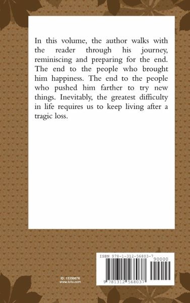 In this volume, the author walks with the reader through his journey, reminiscing and preparing for the end. The end to the people who brought him happiness. The end to the people who pushed him farther to try new things. Inevitably, the greatest difficulty in life requires us to keep living after a tragic loss.