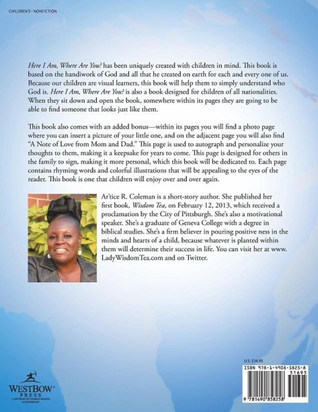 Here I Am, Where Are You? has been uniquely created with children in mind. This book is based on the handiwork of God and all that he created on earth for each and every one of us. Because our children are visual learners, this book will help them to simply understand who God is. Here I Am, Where Are You? is also a book designed for children of all nationalities. When they sit down and open the book, somewhere within its pages they are going to be able to find someone that looks just like them. This book also comes with an added bonus-within its pages you will find a photo page where you can insert a picture of your little one, and on the adjacent page you will also find "A Note of Love from Mom and Dad." This page is used to autograph and personalize your thoughts to them, making it a keepsake for years to come. This page is designed for others in the family to sign, making it more personal, which this book will be dedicated to. Each page contains rhyming words and colorful illustrations that will be appealing to the eyes of the reader. This book is one that children will enjoy over and over again.