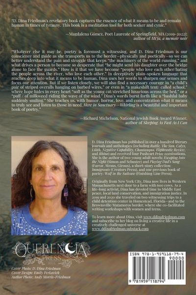 "Whatever else it may be, poetry is foremost a witnessing, and D. Dina Friedman is our conscience and guide as she transports us to the border-physically and poetically-so we can better understand the pain and struggle that keeps "the machinery of the world running," and what drives a person to become so desperate that "he might send his daughter over the bridge alone to face the guards." How is it that we have become "people who love each other / hating the people across the river, who love each other." In deceptively plain-spoken language that reaches deep into what it means to be human, Dina uses her words to sharpen our senses and focus our attention. But if we listen closely, we will also find a necessary courage in "a child's pair of striped overalls hanging on barbed wires," or even in "a makeshift tent / called school," where hope hides in every heart "soft as the young cat / stretched luxurious across the bed," or a "puff / of milkweed riding the wave of the wind." Dina's words burst forth like a "bashful baby suddenly smiling." She teaches us, with humor, horror, love, and concentration what it means to truly see and listen to those in need. Here in Sanctuary-Whirling is a beautiful and important book of poetry." -Richard Michelson, National Jewish Book Award Winner, author of Sleeping As Fast As I Can "D. Dina Friedman's revelatory book captures the essence of what it means to be and remain human in times of tyranny. This book is a meditation tool for both seeker and cynic." -Magdalena Gómez, Poet Laureate of Springfield, MA (2019-2022); author of Mi'ja, a memoir noir