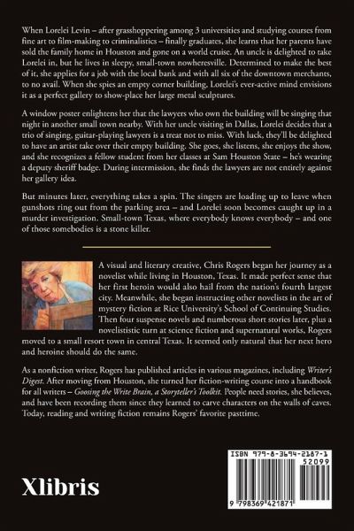When Lorelei Levin - after grasshoppering among 3 universities and studying courses from fine art to film-making to criminalistics - finally graduates, she learns that her parents have sold the family home in Houston and gone on a world cruise. An uncle is delighted to take Lorelei in, but he lives in sleepy, small-town nowheresville. Determined to make the best of it, she applies for a job with the local bank and with all six of the downtown merchants, to no avail. When she spies an empty corner building, Lorelei's ever-active mind envisions it as a perfect gallery to show-place her large metal sculptures. A window poster enlightens her that the lawyers who own the building will be singing that night in another small town nearby. With her uncle visiting in Dallas, Lorelei decides that a trio of singing, guitar-playing lawyers is a treat not to miss. With luck, they'll be delighted to have an artist take over their empty building. She goes, she listens, she enjoys the show, and she recognizes a fellow student from her classes at Sam Houston State - he's wearing a deputy sheriff badge. During intermission, she finds the lawyers are not entirely against her gallery idea. But minutes later, everything takes a spin. The singers are loading up to leave when gunshots ring out from the parking area - and Lorelei soon becomes caught up in a murder investigation. Small-town Texas, where everybody knows everybody - and one of those somebodies is a stone killer.