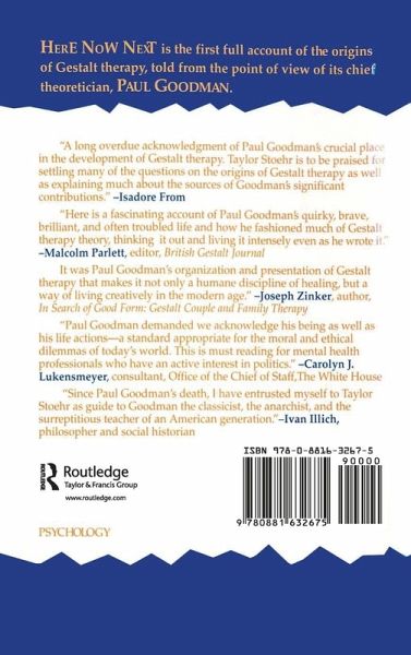 Paul Goodman left his mark in a number of fields: he went from being known as a social critic and philosopher of the New Left to poet and literary critic to author of influential works on education (Compulsory Mis-education) and community planning (Communitas). Perhaps his most significant achievement was in his contribution to the founding and theoretical portion of the classic text Gestalt Therapy (with F. S. Perls and R. E. Hefferline, 1951), still regarded as the cornerstone of Gestalt practice. Taylor Stoher's Here Now Next is the first scholarly account of the origins of Gestalt therapy, told from the point of view of its chief theoretician by a man who knew him well. Stoehr describes both Goodman's role in establishing the principal ideas of the Gestalt movement and the ways in which his practice as a therapist changed him, ultimately leading to a new vocation as the "socio-therapist" of the body politic. He places Goodman in the midst of his world, showing how his personal and public life - including his political activities in the 1960s - were transformed by Gestalt ideas, and he presents revealing sketches of other major figures from those days - Fritz Perls, Wilhelm Reich, A. S. Neill, and others.