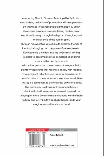 Introducing Here to Stay (an Anthology) by Ty Smith, a mesmerizing collection of poems that will sweep readers off their feet. In this remarkable anthology, Ty Smith showcases his poetic prowess, taking readers on an emotional journey through the depths of love, loss, and the resilience of the human spirit. Through his evocative verses, Smith explores themes of identity, belonging, and the power of self-expression. Each poem is a window into the poet's soul, inviting readers to contemplate life's complexities and find solace in the beauty of words. With lyrical grace and a keen sense of imagery, Smith paints vivid pictures that resonate deeply with readers. From poignant reflections on personal experiences to heartfelt odes to the wonders of the natural world, Here to Stay is a testament to the enduring power of poetry. This anthology is a treasure trove of emotions, a collection that will leave readers moved, inspired, and longing for more. Dive into the enchanting world of Here to Stay and let Ty Smith's poetic brilliance ignite your imagination and touch your heart.