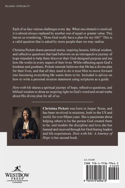 Each of us face various challenges every day. When one obstacle is resolved, it is almost always replaced by another one of equal or greater value. This leaves us wondering, "Does God really have a plan for my life?" This is a valid question that is asked by more people than we may realize. Christina Pickett shares personal stories, inspiring lessons, biblical wisdom, and reflective questions that lead believers on an introspective journey of hope intended to help them discover their God-designed purpose and see how He works in every aspect of their lives. While reflecting upon God's kindness and goodness, Pickett reminds believers that He has a divine plan for their lives, and that all they need to do is trust Him to move forward into becoming everything He wants them to be. Included is advice on how to write a personal mission statement using scriptures as a guide. Here with Me shares a spiritual journey of hope, reflective questions, and biblical wisdom to shine an inspiring light on God's word and reveal truths about His divine plan for all of us.