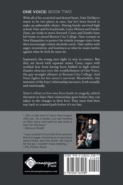 One Voice: Book Two With all of his scratched and dented heart, Nate DeMarco wants to be two places at once, but he's been forced to make an unbearable choice. Having barely survived high school, Nate and his boyfriends, Casey Minton and Zander Zane, are ready to move forward. Casey and Zander have left home to attend Boston City College. Nate remains in New Hampshire to protect his volatile younger sister from their increasingly violent, alcoholic uncle. Nate suffers with anger, resentment, and loneliness as what he wants battles against what he feels he must do. Separated, the young men fight to stay in contact. But they are faced with separate issues. Casey copes with residual fear from having been bullied in high school. Zander obsesses over the establishment of One Voice, the gay-straight alliance at Boston City College. And Nate fights for his sister's survival. Meanwhile, the intensity of the boys' relationship increases, both sexually and emotionally. Nate's effort to live two lives leads to tragedy, which threatens to blast their relationship apart before they can adjust to the changes in their lives. They must find their way back to a united path before it's too late.