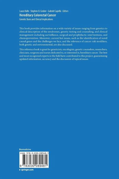 Part1 : GENETIC CAUSES AND ASSOCIATED PHENOTYPES- Lynch syndrome.- The molecular basis of Lynch-like syndrome.- Constitutional mismatch repair deficiency.- Mismatch repair proficient hereditary non-polyposis colorectal cancer.- Genetic and environmental modifiers of risk in Lynch syndrome.- ADENOMATOUS POLYPOSIS SYNDROMES- Introduction.- Familial adenomatous polyposis.- Polymerase proofreading-associated polyposis.- MUTYH-associated polyposis.- NTHL1-associated polyposis.- Germline biallelic inactivation of MMR genes (with polyposis phenotype).- Unexplained adenomatous polyposis.- HAMARTOMATOUS POLYPOSIS SYNDROMES- Peutz-Jeghers syndrome.- Juvenile polyposis syndrome.- PTEN-hamartoma tumor syndromes.- Other hamartomatous polyposis conditions.- HEREDITARY MIXED POLYPOSIS SYNDROME.- SERRATED POLYPOSIS SYNDROME.- Part2: GENETIC DIAGNOSTICS and CLINICAL MANAGEMENT.- Genetic testing in hereditary colorectal cancer.- Universal tumor screening for Lynchsyndrome.- Classification of genetic variants. Prediction models for Lynch syndrome.- Surveillance guidelines for hereditary colorectal cancer syndromes.- Surgical management of hereditary colorectal cancer syndromes.- Chemoprevention in hereditary colorectal cancer syndromes.- Immunotherapy in hereditary colorectal cancer.- The Immune Biology of Microsatellite Unstable cancer.- Hereditary colorectal cancer: Immunotherapy approaches.- Medical oncology management of hereditary colorectal cancer. Part3: REGISTRIES and DATABASES.- Databases: intentions, capabilities and limitations.- The Colon Cancer Family Registry Cohort.- The Prospective Lynch Syndrome Database.- The InSiGHT Database: An example LOVD system.- The International Mismatch Repair Consortium.