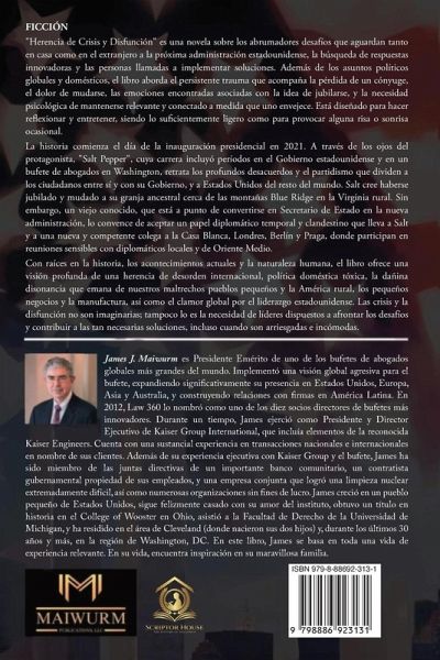 FICCIÓN "Herencia de Crisis y Disfunción" es una novela sobre los abrumadores desafíos que aguardan tanto en casa como en el extranjero a la próxima administración estadounidense, la búsqueda de respuestas innovadoras y las personas llamadas a implementar soluciones. Además de los asuntos políticos globales y domésticos, el libro aborda el persistente trauma que acompaña la pérdida de un cónyuge, el dolor de mudarse, las emociones encontradas asociadas con la idea de jubilarse, y la necesidad psicológica de mantenerse relevante y conectado a medida que uno envejece. Está diseñado para hacer reflexionar y entretener, siendo lo suficientemente ligero como para provocar alguna risa o sonrisa ocasional. La historia comienza el día de la inauguración presidencial en 2021. A través de los ojos del protagonista, "Salt Pepper", cuya carrera incluyó períodos en el Gobierno estadounidense y en un bufete de abogados en Washington, retrata los profundos desacuerdos y el partidismo que dividen a los ciudadanos entre sí y con su Gobierno, y a Estados Unidos del resto del mundo. Salt cree haberse jubilado y mudado a su granja ancestral cerca de las montañas Blue Ridge en la Virginia rural. Sin embargo, un viejo conocido, que está a punto de convertirse en Secretario de Estado en la nueva administración, lo convence de aceptar un papel diplomático temporal y clandestino que lleva a Salt y a una nueva y competente colega a la Casa Blanca, Londres, Berlín y Praga, donde participan en reuniones sensibles con diplomáticos locales y de Oriente Medio. Con raíces en la historia, los acontecimientos actuales y la naturaleza humana, el libro ofrece una visión profunda de una herencia de desorden internacional, política doméstica tóxica, la dañina disonancia que emana de nuestros maltrechos pueblos pequeños y la América rural, los pequeños negocios y la manufactura, así como el clamor global por el liderazgo estadounidense. Las crisis y la disfunción no son imaginarias; tampoco lo es la necesidad de líderes dispuestos a afrontar los desafíos y contribuir a las tan necesarias soluciones, incluso cuando son arriesgadas e incómodas.