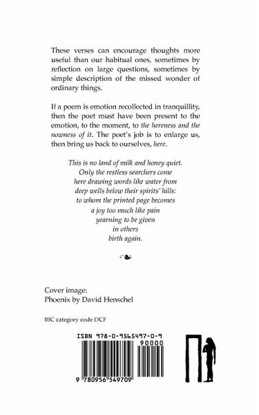 These well-crafted verses encourage thoughts more useful than our habitual ones, sometimes by reflection on large questions, sometimes by simple description of the missed wonder of ordinary things. The collected verses of the late David Henschel, subtitled 'poems from a life,' are presented together with a foreword by one of his former students and additional poems by Norah Henschel, Martin Dace and John Torrance. The poet's job is to enlarge us, then bring us back to ourselves, here. This David Henschel achieves in verses which, while pushing beyond the limits of traditional form, still use the old tools from the poet's toolbox: alliteration, internal rhyme, rhythm and every device that bends words into full meaning. "This is no land of milk and honey quiet. Only the restless searchers come here drawing words like water from deep wells below their spirits' hills: a joy too much like pain yearning to be given in others birth again."
