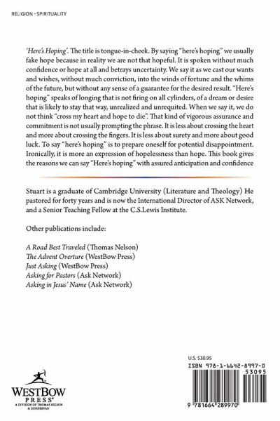 'Here's Hoping'. The title is tongue-in-cheek. By saying "here's hoping" we usually fake hope because in reality we are not that hopeful. It is spoken without much confidence or hope at all and betrays uncertainty. We say it as we cast our wants and wishes, without much conviction, into the winds of fortune and the whims of the future, but without any sense of a guarantee for the desired result. "Here's hoping" speaks of longing that is not firing on all cylinders, of a dream or desire that is likely to stay that way, unrealized and unrequited. When we say it, we do not think "cross my heart and hope to die". That kind of vigorous assurance and commitment is not usually prompting the phrase. It is less about crossing the heart and more about crossing the fingers. It is less about surety and more about good luck. To say "here's hoping" is to prepare oneself for potential disappointment. Ironically, it is more an expression of hopelessness than hope. This book gives the reasons we can say "Here's hoping" with assured anticipation and confidence