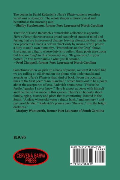 At its heart, David Radavich's Here's Plenty evokes the American South-in all its messy, charming, baffling glory. As a microcosm of the fragile planet we inhabit, this region struggles with violence, poverty, racism, and outdated social convention. And yet the everrenewing beauty of the fertile landscape, a deep-seated love of story-telling, and the warmth of everyday people bring us the possibility of re-assessment and redemption. Radavich's poems embody the mesmerizing complexities of human life.