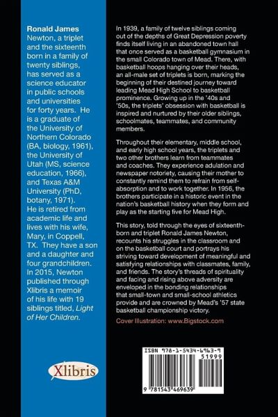 In 1939, a family of twelve siblings coming out of the depths of Great Depression poverty finds itself living in an abandoned town hall that once served as a basketball gymnasium in the small Colorado town of Mead. There, with basketball hoops hanging over their heads, an all-male set of triplets is born, marking the beginning of their destined journey toward leading Mead High School to basketball prominence. Growing up in the 40s and 50s, the triplets obsession with basketball is inspired and nurtured by their older siblings, schoolmates, teammates, and community members. Throughout their elementary, middle school, and early high school years, the triplets and two other brothers learn from teammates and coaches. They experience adulation and newspaper notoriety, causing their mother to constantly remind them to refrain from self-absorption and to work together. In 1956, the brothers participate in a historic event in the nations basketball history when they form and play as the starting five for Mead High. This story, told through the eyes of sixteenth-born and triplet Ronald James Newton, recounts his struggles in the classroom and on the basketball court and portrays his striving toward development of meaningful and satisfying relationships with classmates, family, and friends. The storys threads of spirituality and facing and rising above adversity are enveloped in the bonding relationships that small-town and small-school athletics provide and are crowned by Meads 57 state basketball championship victory.