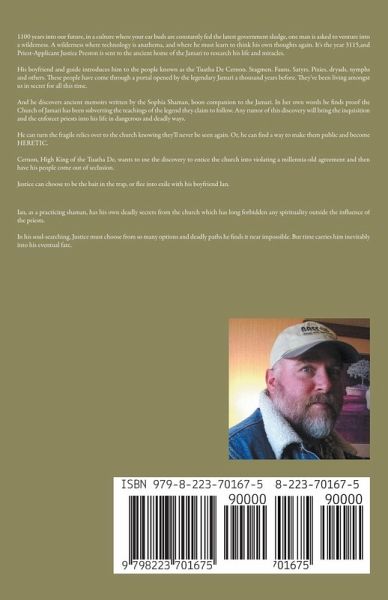 1100 years into our future, in a culture where your ear buds are constantly fed the latest government sludge, one man is asked to venture into a wilderness. A wilderness where technology is anathema, and where he must learn to think his own thoughts again. It's the year 3115,and Priest-Applicant Justice Preston is sent to the ancient home of the Jamari to research his life and miracles. His boyfriend and guide introduces him to the people known as the Tuatha De Cernon. Stagmen. Fauns. Satyrs. Pixies, dryads, nymphs and others. These people have come through a portal opened by the legendary Jamari a thousand years before. They've been living amongst us in secret for all this time. And he discovers ancient memoirs written by the Sophia Shaman, boon companion to the Jamari. In her own words he finds proof the Church of Jamari has been subverting the teachings of the legend they claim to follow. Any rumor of this discovery will bring the inquisition and the enforcer priests into his life in dangerous and deadly ways. He can turn the fragile relics over to the church knowing they'll never be seen again. Or, he can find a way to make them public and become HERETIC. Cernon, High King of the Tuatha De, wants to use the discovery to entice the church into violating a millennia-old agreement and then have his people come out of seclusion. Justice can choose to be the bait in the trap, or flee into exile with his boyfriend Ian. Ian, as a practicing shaman, has his own deadly secrets from the church which has long forbidden any spirituality outside the influence of the priests. In his soul-searching, Justice must choose from so many options and deadly paths he finds it near impossible. But time carries him inevitably into his eventual fate.