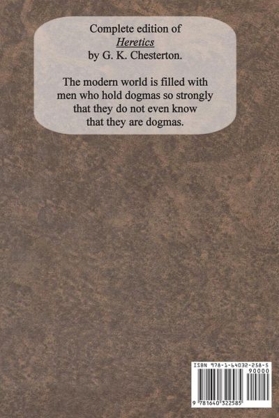 Complete edition of Heretics by G. K. Chesterton. Chesterton discusses ideas by H. G. Wells, George Bernard Shaw, Kipling and others of his day in his argument for God. Still thought provoking after 100 years, find out why in this complete reproduction of the 1905 British Edition. Deep common sense on every page, it includes great thoughts such as these: "The modern world is filled with men who hold dogmas so strongly that they do not even know that they are dogmas." Witty, deep, and positively entertaining, no student of thought should be without this historic book. This edition is provided in a slim volume with full text at an affordable price. TABLE OF CONTENTS 1. INTRODUCTORY REMARKS ON THE IMPORTANCE OF ORTHODOXY 3 2. ON THE NEGATIVE SPIRIT 6 3. ON MR. RUDYARD KIPLING AND MAKING THE WORLD SMALL 10 4. MR. BERNARD SHAW 14 5. MR. H.G. WELLS AND THE GIANTS 18 6. CHRISTMAS AND THE AESTHETES 25 7. OMAR AND THE SACRED VINE 28 8. THE MILDNESS OF THE YELLOW PRESS 31 9. THE MOODS OF MR. GEORGE MOORE 35 10. ON SANDALS AND SIMPLICITY 37 11. SCIENCE AND THE SAVAGES 39 12. PAGANISM AND MR. LOWES DICKINSON 42 13. CELTS AND CELTOPHILES 47 14. ON CERTAIN MODERN WRITERS AND THE INSTITUTION OF THE FAMILY 49 15. ON SMART NOVELISTS AND THE SMART SET 53 16. ON MR. MCCABE AND A DIVINE FRIVOLITY 59 17. ON THE WIT OF WHISTLER 64 18. THE FALLACY OF THE YOUNG NATION 68 19. SLUM NOVELISTS AND THE SLUMS 73 20. CONCLUDING REMARKS ON THE IMPORTANCE OF ORTHODOXY 78
