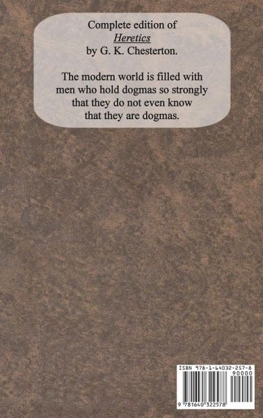 Complete edition of Heretics by G. K. Chesterton. Chesterton discusses ideas by H. G. Wells, George Bernard Shaw, Kipling and others of his day in his argument for God. Still thought provoking after 100 years, find out why in this complete reproduction of the 1905 British Edition. Deep common sense on every page, it includes great thoughts such as these: "The modern world is filled with men who hold dogmas so strongly that they do not even know that they are dogmas." Witty, deep, and positively entertaining, no student of thought should be without this historic book. This edition is provided in a slim volume with full text at an affordable price. TABLE OF CONTENTS 1. INTRODUCTORY REMARKS ON THE IMPORTANCE OF ORTHODOXY 3 2. ON THE NEGATIVE SPIRIT 6 3. ON MR. RUDYARD KIPLING AND MAKING THE WORLD SMALL 10 4. MR. BERNARD SHAW 14 5. MR. H.G. WELLS AND THE GIANTS 18 6. CHRISTMAS AND THE AESTHETES 25 7. OMAR AND THE SACRED VINE 28 8. THE MILDNESS OF THE YELLOW PRESS 31 9. THE MOODS OF MR. GEORGE MOORE 35 10. ON SANDALS AND SIMPLICITY 37 11. SCIENCE AND THE SAVAGES 39 12. PAGANISM AND MR. LOWES DICKINSON 42 13. CELTS AND CELTOPHILES 47 14. ON CERTAIN MODERN WRITERS AND THE INSTITUTION OF THE FAMILY 49 15. ON SMART NOVELISTS AND THE SMART SET 53 16. ON MR. MCCABE AND A DIVINE FRIVOLITY 59 17. ON THE WIT OF WHISTLER 64 18. THE FALLACY OF THE YOUNG NATION 68 19. SLUM NOVELISTS AND THE SLUMS 73 20. CONCLUDING REMARKS ON THE IMPORTANCE OF ORTHODOXY 78