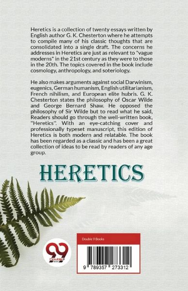 Heretics is a collection of twenty essays written by English author G. K. Chesterton where he attempts to compile many of his classic thoughts that are consolidated into a single draft. The concerns he addresses in Heretics are just as relevant to "vague moderns" in the 21st century as they were to those in the 20th. The topics covered in the book include cosmology, anthropology, and soteriology. He also makes arguments against social Darwinism, eugenics, German humanism, English utilitarianism, French nihilism, and European elite hubris. G. K. Chesterton states the philosophy of Oscar Wilde and George Bernard Shaw. He opposed the philosophy of Sir Wilde but to read what he said, Readers should go through the well-written book, ''Heretics''. With an eye-catching cover and professionally typeset manuscript, this edition of Heretics is both modern and relatable. The book has been regarded as a classic and has been a great collection of ideas to be read by readers of any age group.