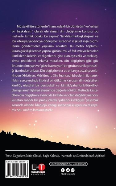 Müstakil literatürlerde 'inanç odakl¿ bir dönü¿üm' ve 'ruhsal bir bäkalä¿m' olarak ele al¿nan din de¿i¿tirme konusu, bu metinde 'kimlik odakl¿ bir sapma', 'farkl¿läma/bäkaläma' ve 'bir ötekiye/yabanc¿ya dönü¿me' sürecinin ili¿kisel in¿a biçimlerine göndermeler yap¿larak anlat¿ld¿. Bu metin, toplumu kuran güç ili¿kilerinin yap¿sal görünümü ve fail imleyicileri olan kimliklerin özlerini ve di¿erlerini içine alan e¿itsizlik ve ötekile¿tirme pratiklerini anlama merak¿n¿, din de¿i¿tiren gibi göz önünde olmayan ve 'göze batmayan' bir grubun sinik çaresizli¿i üzerinden anlatt¿. Din de¿i¿tirenler ve onlar¿n sosyal çevrelerinden (Hristiyan, Müslüman, Dini ¿nançs¿z) bireylerin öz-tan¿kl¿klar¿ çerçevesinde ili¿kisel bir döküme kavu¿an din de¿i¿tiren kimli¿i, ele¿tirel bir perspektif ve 'kimlik/yabanc¿l¿k/ötekilik/damgalama' ili¿kileri ekseninde de¿erlendirildi. Metinde kastedilen din de¿i¿tiren, inanc¿yla birlikte var olan de¿ildir; inanc¿n¿ ku¿atan maddi bir pratik olarak 'yabanc¿ kimli¿iyle' yäamak zorunda oland¿r. ¿deolojik varl¿¿¿, inanc¿n¿n kurgusunu d¿¿layarak onu Araf'ta b¿rakmaktad¿r.