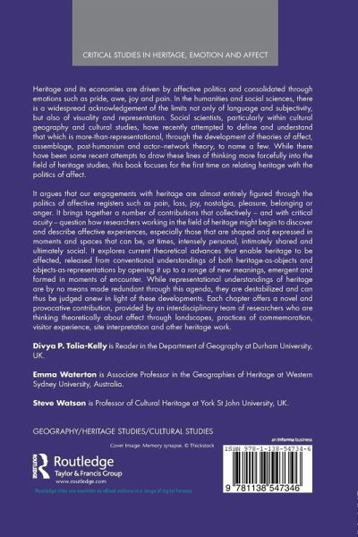 Heritage and its economies are driven by affective politics and consolidated through emotions such as pride, awe, joy and pain. In the humanities and social sciences, there is a widespread acknowledgement of the limits not only of language and subjectivity, but also of visuality and representation. Social scientists, particularly within cultural geography and cultural studies, have recently attempted to define and understand that which is more-than-representational, through the development of theories of affect, assemblage, post-humanism and actor network theory, to name a few. While there have been some recent attempts to draw these lines of thinking more forcefully into the field of heritage studies, this book focuses for the first time on relating heritage with the politics of affect. The volume argues that our engagements with heritage are almost entirely figured through the politics of affective registers such as pain, loss, joy, nostalgia, pleasure, belonging or anger. It brings together a number of contributions that collectively - and with critical acuity - question how researchers working in the field of heritage might begin to discover and describe affective experiences, especially those that are shaped and expressed in moments and spaces that can be, at times, intensely personal, intimately shared and ultimately social. It explores current theoretical advances that enable heritage to be affected, released from conventional understandings of both 'heritage-as-objects' and 'objects-as-representations' by opening it up to a range of new meanings, emergent and formed in moments of encounter. Whilst representational understandings of heritage are by no means made redundant through this agenda, they are destabilized and can thus be judged anew in light of these developments. Each chapter offers a novel and provocative contribution, provided by an interdisciplinary team of researchers who are thinking theoretically about affect through landscapes, practices of commemoration, visitor experience, site interpretation and other heritage work.