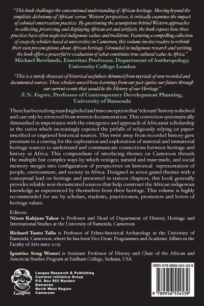 There has been a long standing belief and misconception that 'relevant' history is shelved and can only be retrieved from written documentation. This conviction systematically diminished in importance with the emergence and approach of Africanist scholarship in the 1960s which increasingly exposed the pitfalls of religiously relying on paper- inscribed or engraved historical sources. This twist away from recorded history gave premium to a craving for the exploration and exploitation of material and immaterial heritage sources to understand and communicate connections between heritage and history in Africa. This compendium of interlacing themes on Cameroon threads the multiple but complex ways by which vestiges; natural and man-made, and social memory merges into confi guration of perspectives on historical representation of people, environment, and society in Africa. Designed in seven grand themes with a conceptual lead on heritage and presented in sixteen chapters, this book generally provides reliable non-documented sources that help construct the African indigenous knowledge as experienced by themselves from their heritage. This volume is highly recommended for use by scholars, students, practitioners, promoters and lovers of heritage values.