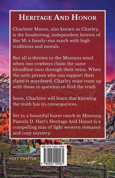 Charlotte Mason, also known as Charley, is the headstrong, independent heiress of Bar M: a family-run ranch with high traditions and morals. But all is thrown to the Montana wind when two cowboys claim the same bloodline runs through their veins. When the only person who can support their claim is murdered, Charley must team up with those in question to find the truth. Soon, Charlotte will learn that knowing the truth has its consequences. Set in a beautiful horse ranch in Montana, Pamela D. Hart's Heritage And Honor is a compelling mix of light western romance and cozy mystery.