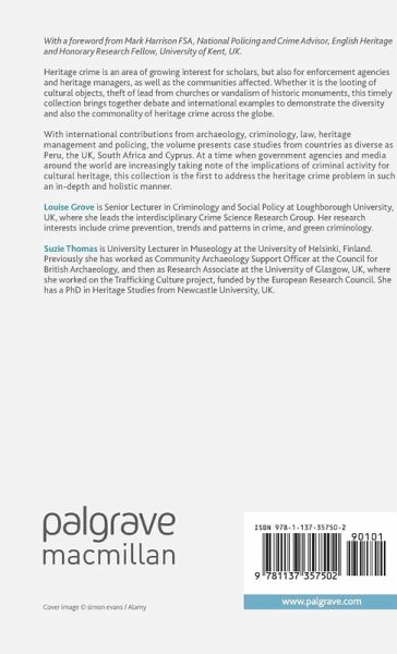 Foreword; Mark Harrison 1. Introduction; Suzie Thomas and Louise Grove Section I: Heritage Crime around the World 2. South African Perspective on Thefts from Museums and Galleries: 2006-2010; Bernadine Benson and Henri Fouché 3. Archaeological Heritage in Peru: Definitions, Perceptions and Imperceptions; Henry Tantaleán 4. Forestry as Heritage Crime: Finland; Vesa Laulumaa 5. Archaeological Heritage Crimes in Romania and Moldova: A Comparative view; Sergiu Musteata 6. Threats to Cultural Heritage in the Cyprus Conflict; Sam Hardy Section II: Tackling Heritage Crime 7. A Situational Approach to Heritage Crime Prevention; Louise Grove and Ken Pease 8. Understanding and Preventing Lead Theft from Churches: A Script Analysis; Victoria Price, Aiden Sidebottom and Nick Tilley 9. Understanding and Attitudes - Heritage Crime in Norway; Brian Kristian Wennberg 10. Developing Policy on Heritage Crime in Southern Africa; Helene Vollgraaff 11. Improving the Treatment of Heritage Crimein Criminal Proceedings: Towards a Better Understanding of the Impact of Heritage Offences; Carolyn Shelbourn 12. The Global Trade in Illicit Antiquities: Some New Directions?; Kenneth Polk 13. Conclusion; What's the Future for Heritage Crime Research?; Suzie Thomas and Louise Grove