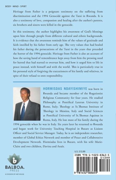 Heritage from Father is a poignant testimony on the suffering from discrimination and the 1994 Genocide against the Tutsi in Rwanda. It is also a testimony of love, compassion and healing after the author's parents, six brothers and sisters were killed in the genocide. In this testimony, the author highlights his awareness of God's blessings upon him through people from different cultural and ethnic backgrounds. It is evidence that the awareness reminds him of the values of gratitude and faith instilled by his father from early age. The very values that had healed his father during the persecutions of the Tutsi in the years that preceded the horror of the 1994 genocide. Heritage from Father is also an account of how the saving hand of remembrance kept away from him the pressing need for hatred that had started to overrun him, and how it urged him to life in peace instead, with himself and with the world. This is particularly true in his personal style of forgiving the executioners of his family and relatives, in spite of their refusal to own responsibility.
