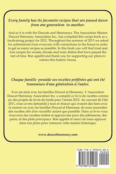 Every family has its favourite recipes that are passed down from one generation to another. And so it is with the Doucets and Hennessys. The Association Maison Doucet Hennessy Association Inc., has compiled this recipe book as a fundraising project for 2012. Throughout the summer of 2011 we asked for submissions from everyone with connections to the house in order to get as many recipes as possible. In this book you will find tried and true recipes for sweets, breads and main dishes that have passed the test of time. Bon appetit and thank you for supporting our plans to restore this historic house at 375 St Peter Avenue, Bathurst, New Brunswick. Chaque famille possède ses recettes préférées qui ont été transmises d'une génération à l'autre. Il en est ainsi avec les familles Doucet et Hennessy. L'Association Doucet Hennessy Association Inc. a compilé ce livre de recettes comme un des projets de levée de fonds pour l'année 2012. Au courant de l'été 2011, nous avons demandé à tous et chacun qui avaient des liens avec la maison ou avec les familles Doucet et Hennessy de nous soumettre des recettes afin d'en recueillir autant que possible. Dans ce livre vous trouverez des recettes testées et approuvées pour des pâtisseries, des pains, et des plats principaux. Bon appétit et merci de nous appuyer dans nos plans pour restaurer cette maison historique au 375 avenue St-Pierre, Bathurst, Nouveau-Brunswick.