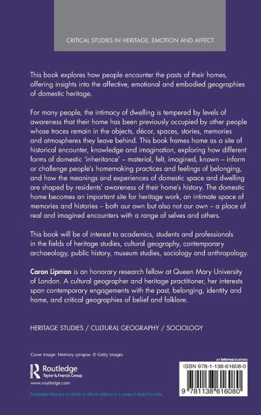 Acknowledgements;1: Introduction: heritage in the home in context; Part I: Experiencing the past at home 2: Knowing and imagining the past at home; 3: Presences of the past: energies, auras, ghosts; Part II: Past residents at home 4: Connecting with the past: domestic genealogies; 5: Belonging to the past: negotiating ownership; Part III: Material pasts at home 6: Found objects: the tangible past at home; 7: Improving home: the ethics and aesthetics of custodianship; Conclusion: heritage in the home in wider context; Index