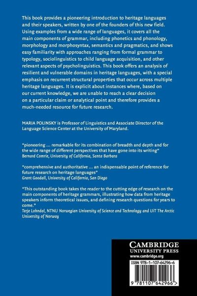 A pioneering introduction to heritage languages that covers all the main components of grammar and shows easy familiarity with approaches ranging from formal grammar to typology, and from sociolinguistics to psycholinguistics. Written by a leading scholar in the study of heritage languages, it is the foundational book on the subject.