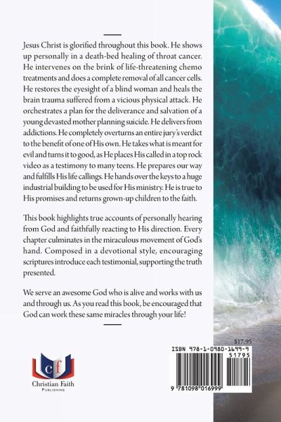 Jesus Christ is glorified throughout this book. He shows up personally in a death-bed healing of throat cancer. He intervenes on the brink of life-threatening chemo treatments and does a complete removal of all cancer cells. He restores the eyesight of a blind woman and heals the brain trauma suffered from a vicious physical attack. He orchestrates a plan for the deliverance and salvation of a young devasted mother planning suicide. He delivers from addictions. He completely overturns an entire jury's verdict to the benefit of one of His own. He takes what is meant for evil and turns it to good, as He places His called in a top rock video as a testimony to many teens. He prepares our way and fulfills His life callings. He hands over the keys to a huge industrial building to be used for His ministry. He is true to His promises and returns grown-up children to the faith. This book highlights true accounts of personally hearing from God and faithfully reacting to His direction. Every chapter culminates in the miraculous movement of God's hand. Composed in a devotional style, encouraging scriptures introduce each testimonial, supporting the truth presented. We serve an awesome God who is alive and works with us and through us. As you read this book, be encouraged that God can work these same miracles through your life!