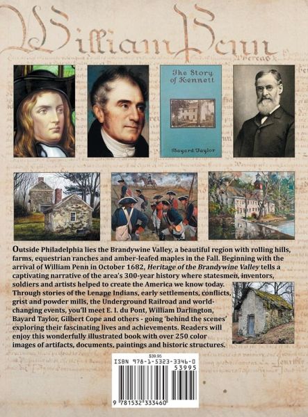 Outside Philadelphia lies the Brandywine Valley, a beautiful region with rolling hills, farms, equestrian ranches and amber-leafed maples in the Fall. Beginning with the arrival of William Penn in October 1682, Heritage of the Brandywine Valley tells a captivating narrative of the area's 300-year history where statesmen, inventors, soldiers and artists helped to create the America we know today. Through stories of the Lenape Indians, early settlements, conflicts, grist and powder mills, the Underground Railroad and world-changing events, you'll meet E. I. du Pont, William Darlington, Bayard Taylor, Gilbert Cope and others - going 'behind the scenes' exploring their fascinating lives and achievements. Readers will enjoy this wonderfully illustrated book with over 250 color images of artifacts, documents, paintings and historic structures.