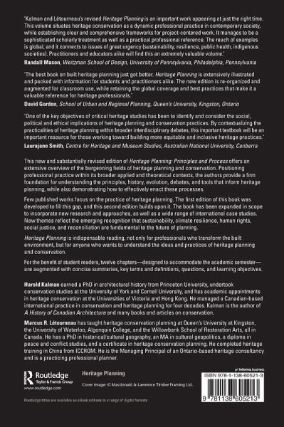 Harold Kalman earned a PhD in architectural history from Princeton University, undertook conservation studies at the University of York and Cornell University, and has academic appointments in heritage conservation at the Universities of Victoria and Hong Kong. He managed a Canadian-based international practice in conservation and heritage planning for four decades. Kalman is the author of A History of Canadian Architecture and many books and articles on conservation. Marcus R. Létourneau teaches heritage conservation planning at Queen's University at Kingston, the University of Waterloo, Algonquin College, and the Willowbank School of Restoration Arts, all in Canada. He has a PhD in historical/cultural geography, an MA in cultural geopolitics, a diploma in peace and conflict studies, and a certificate in heritage conservation planning. He completed heritage training in China from ICCROM. He is the Managing Principal of an Ontario-based heritage consultancy and is a practicing professional planner.