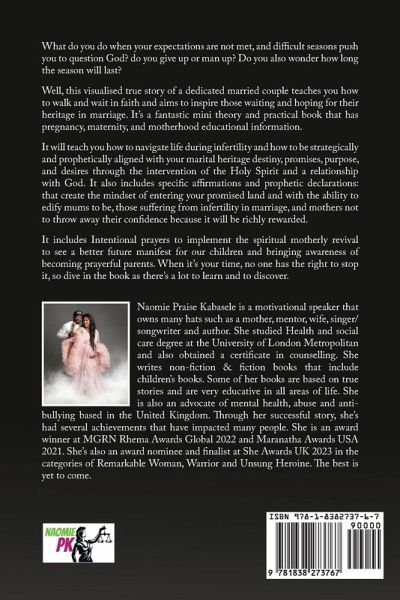 What do you do when your expectations are not met, and difficult seasons push you to question God? do you give up or man up? Do you also wonder how long the season will last? Well, this visualised true story of a dedicated married couple teaches you how to walk and wait in faith and aims to inspire those waiting and hoping for their heritage in marriage. It's a fantastic mini theory and practical book that has pregnancy, maternity, and motherhood educational information. It will teach you how to navigate life during infertility and how to be strategically and prophetically aligned with your marital heritage destiny, promises, purpose, and desires through the intervention of the Holy Spirit and a relationship with God. It also includes specific affirmations and prophetic declarations: that create the mindset of entering your promised land and with the ability to edify mums to be, those suffering from infertility in marriage, and mothers not to throw away their confidence because it will be richly rewarded. It includes Intentional prayers to implement the spiritual motherly revival to see a better future manifest for our children and bring awareness of becoming prayerful parents. When it's your time, no one has the right to stop it, so dive into the book as there's a lot to learn and discover.