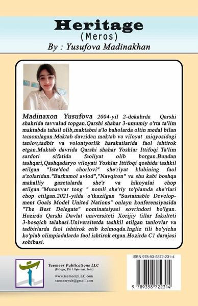 Novelette refers to a brief book or novella. A novel written on a small canvas is known as a "Novelette" and has a distinct place in terms of brevity when compared to the novel. 'Heritage (Meros)' is an Uzbek novelette written by Yusufova Madinakhan. Property, land, gold are not the inheritance. When a person grows up, his inheritance, the thing that needs to be carefully preserved, is his parents and siblings. Heritage is just a word consisting of few letters, but its importance in human life is very great. Especially it looks at the inner feeling of a person.