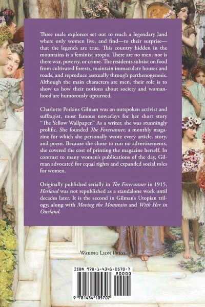 Three male explorers set out to reach a legendary land where only women live, and find-to their surprise-that the legends are true. This country hidden in the mountains is a feminist utopia. There are no men, nor is there war, poverty, or crime. The residents subsist on food from cultivated forests, maintain immaculate houses and roads, and reproduce asexually through parthenogenesis. Although the main characters are men, their role is to show us how their notions about society and womanhood are humorously upturned. Charlotte Perkins Gilman was an outspoken activist and suffragist, most famous nowadays for her short story "The Yellow Wallpaper." As a writer, she was stunningly prolific. She founded The Forerunner, a monthly magazine for which she personally wrote every article, story, and poem. Because she chose to run no advertisements, she covered the cost of printing the magazine herself. In contrast to many women's publications of the day, Gilman advocated for equal rights and expanded social roles for women. Originally published serially in The Forerunner in 1915, Herland was not republished as a standalone work until decades later. It is the second in Gilman's Utopian trilogy, along with Moving the Mountain and With Her in Ourland.