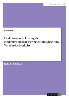 Facharbeit (Schule) aus dem Jahr 2022 im Fachbereich Mathematik - Angewandte Mathematik, Note: 1,0 (Schweiz: 6,0), , Sprache: Deutsch, Abstract: Gegenstand dieser Arbeit ist die sogenannte "Wärmeleitungsgleichung", einer der bekanntesten Differentialgleichungen. Dies sind Gleichungen, die uns etwas über die Änderung einer Funktion sagen. Funktionen zu finden, die solche Gleichungen erfüllen, ist jedoch meistens viel schwieriger, als beispielsweise eine quadratische Gleichung zu lösen, und viele von ihnen sind nicht einmal exakt lösbar. Diesen Gleichungen kann man auch noch gewisse Bedingungen für die Lösungen hinzufügen, wenn nur bestimmte Lösungen von Interesse sind. In dieser Arbeit soll die Herleitung und Lösung der Wärmeleitungsgleichung mit gewählten Bedingungen so erklärt werden, dass auch Gymnasiastinnen und Gymnasiasten sie verstehen können, und vorher noch das dazu erforderte Vorwissen vermittelt werden. Hierzu werden die Herleitung und Lösung, die in Internetquellen zu finden sind, präsentiert und auf verständliche Weise erklärt, indem mehr Umformungsschritte und entscheidende Ideen erläutert werden. Die Wärmeleitungsgleichung und die gewählten Bedingungen können mithilfe dreier physikalischer Gesetzmässigkeiten und mathematischer Umformungen hergeleitet werden. Die Lösung derer mit Berücksichtigung der Bedingungen erfordert einige Schritte, wobei verschiedene Methoden verwendet werden. Die Herleitung und Lösung zu verstehen, erfordert außerdem Kenntnisse im Bereich der Funktionen von zwei Variablen, partiellen Ableitungen und Differentialgleichungen allgemein.