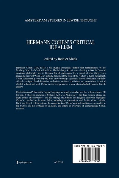 Hermann Cohen (1842-1918) is an original systematic thinker and representative of the Marburg School of Critical Idealism. The Marburg School was a leading school in German academic philosophy and in German Jewish philosophy for a period of over thirty years preceding the First World War. Initially standing at the front of the 'Return to Kant' movement, Cohen subsequently went beyond Kant in developing a system of critical idealism in which he offered a critique of and alternative to absolute idealism, positivism, and materialism. A critical idealist in heart and soul, Cohen is also recognized as a man who embodied German Jewish culture.