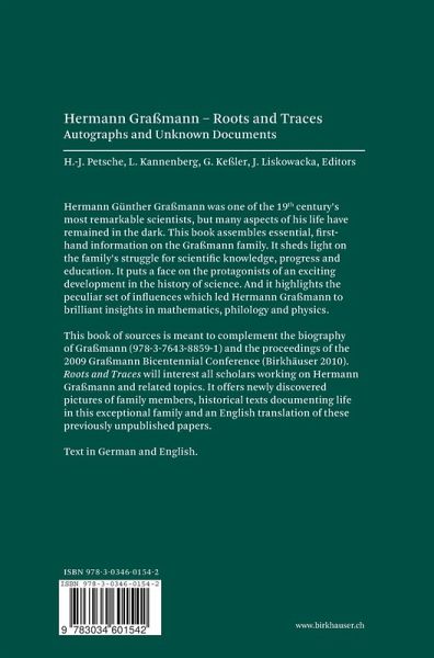 This book of sources is meant to complement the biography of Graßmann and the proceedings of the 2009 Graßmann Bicentennial Conference (Birkhäuser 2010). "Roots and Traces" will interest all scholars working on Hermann Graßmann and related topics. It offers newly discovered pictures of family members, historical texts documenting life in this exceptional family and an English translation of these previously unpublished papers.