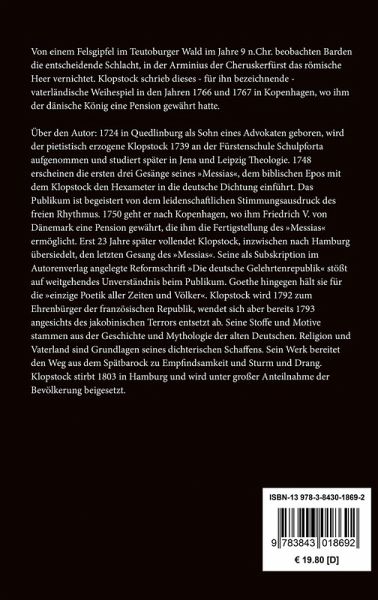 Von einem Felsgipfel im Teutoburger Wald im Jahre 9 n.Chr. beobachten Barden die entscheidende Schlacht, in der Arminius der Cheruskerfürst das römische Heer vernichtet. Klopstock schrieb dieses - für ihn bezeichnende - vaterländische Weihespiel in den Jahren 1766 und 1767 in Kopenhagen, wo ihm der dänische König eine Pension gewährt hatte.
