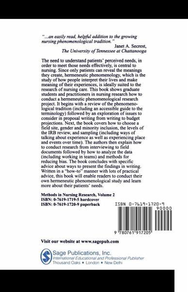 Phenomenological research is a popular method in nursing research. This book introduces hermeneutic phenomenology: the study of how people interpret their lives and derive meaning from their experiences. It includes discussions on site-access, preparation, proposal-writing, ethical issues, data collections, bias reduction, data analysis and research publication.