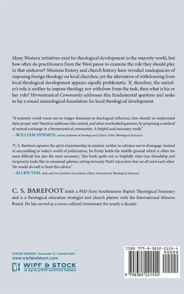 Many Western initiatives exist for theological development in the majority world, but how often do practitioners from the West pause to examine the role they should play in that endeavor? Missions history and church history have revealed inadequacies of imposing foreign theology on local churches, yet the alternative of withdrawing from local theological development appears equally problematic. If, therefore, the outsider's role is neither to impose theology nor withdraw from the task, then what is his or her role? Hermeneutical Community addresses this fundamental question and seeks to lay a sound missiological foundation for local theological development.